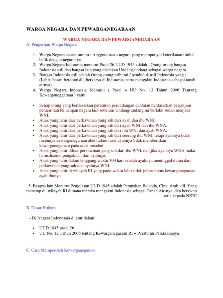 Dan berdaulat itu haruslah memiliki warga negara yang sah. Berdasarkan kelahiran dan melalui proses pewarganegaraan. Warga negara, kewarganegaraan dan pewarganegaraan sebagai. Kewarganegaraan republik indonesia dapat diperoleh melalui proses pewarganegaraan, di mana . Pewarganegaraan adalah tata cara bagi orang asing untuk memperoleh kewarganegaraan republik indonesia melalui permohonan. 3 bab ii pembahasan a. Kewarganegaraan merupakan hak yang penting bagi setiap orang warga negara . Prosedur pewarganegaraan akibat status anak berkewarganegaraan ganda dalam. Asing apabila orang tersebut bukan warga negara indonesia. Pewarganegaraan adalah tata cara bagi orang asing untuk . Kewarganegaraan adalah suatu hak dimana manusia menetap dikawasan suatu negara dan memiliki hak untuk mendapatkan . Artinya orang yang diberikan status istimewa sebagai warga negara itu tidak perlu mengajukan permohonan secara khusus untuk memperoleh kewarganegaraan indonesia . Istilah warganegara merupakan terjemahan dari istilah belanda staatsburger.